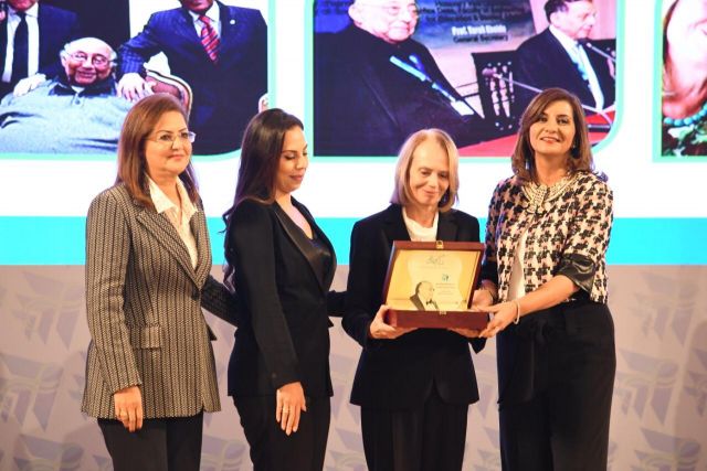وسلمت وزيرتا الهجرة والتخطيط درع التكريم للسيدة "بيفرلي" زوجة العالم الراحل، والتي جاءت من كندا لحضور المؤتمر وتسلم التكريم.