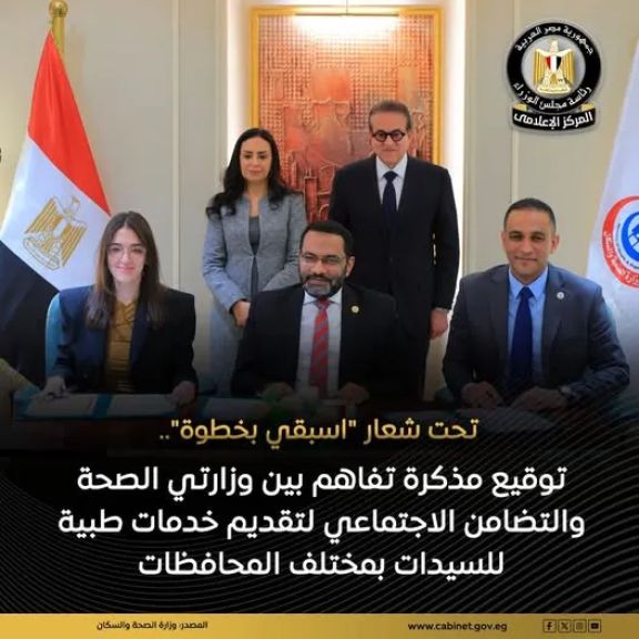 في إطار دعم جهود الارتقاء بصحة المرأة وتحسين جودة الخدمات الصحية المقدمة للسيدات بمختلف محافظات الجمهورية، تم توقيع مذكرة تفاهم بين وزارتي الصحة والتضامن الاجتماعي لتقديم خدمات طبية للسيدات بمختلف المحافظات تحت شعار "اسبقي بخطوة".