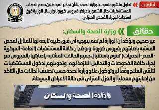 الصحة :لا صحة لتوجيه الوزارة أي فرق طبية للمنازل لفحص المشتبه بإصابتهم...